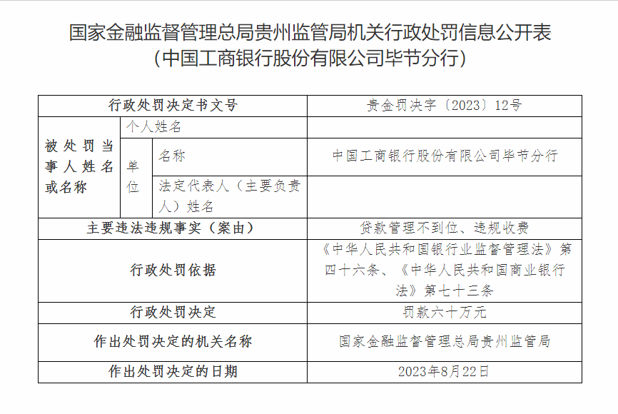 国家金融监督管理总局贵州监管局机关行政处罚中国工商银行信息公开表